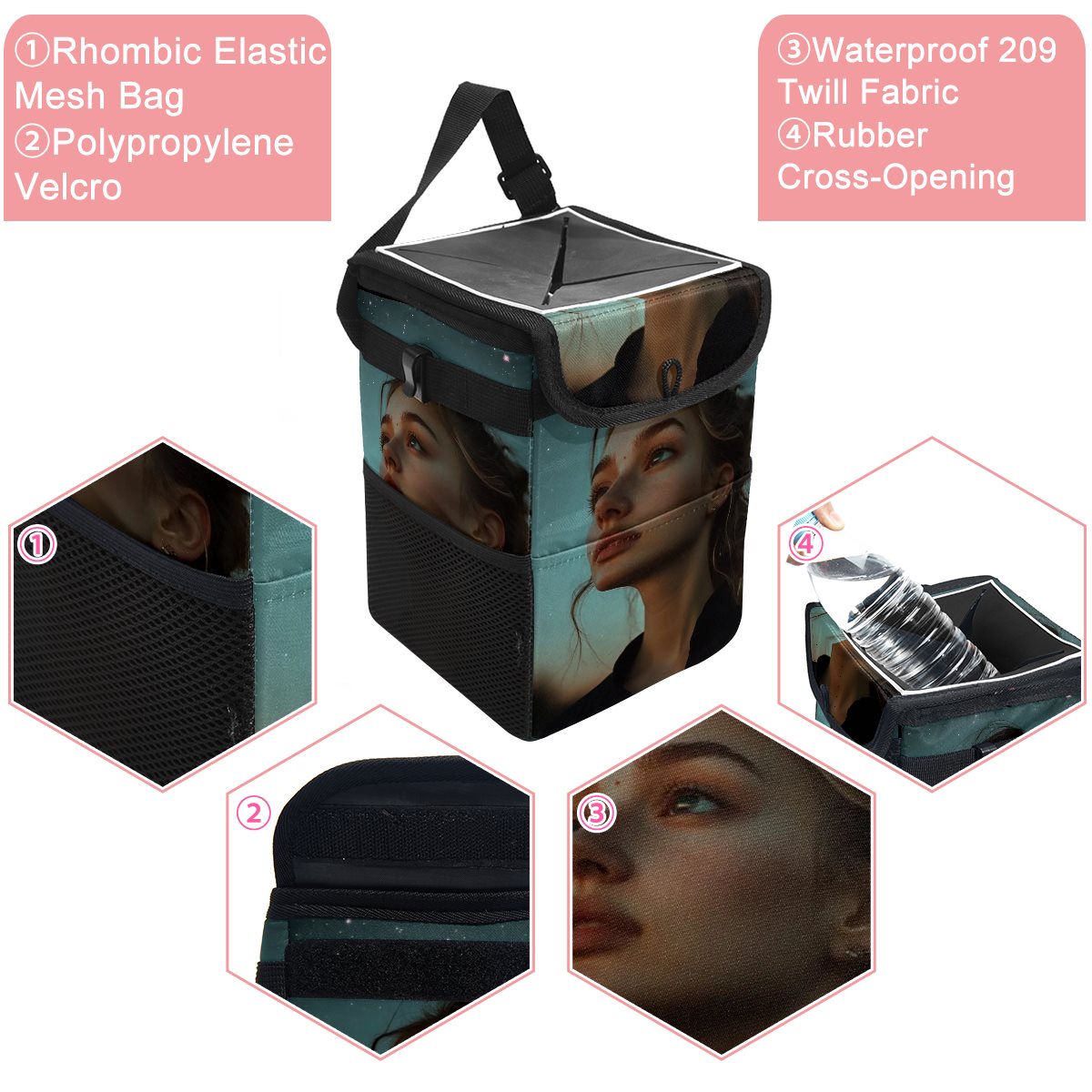 Material: Oxford cloth, rubber cross opening, pp webbing, pp elastic, plastic buckle, 1000g grey board, diamond mesh, pp Velcro